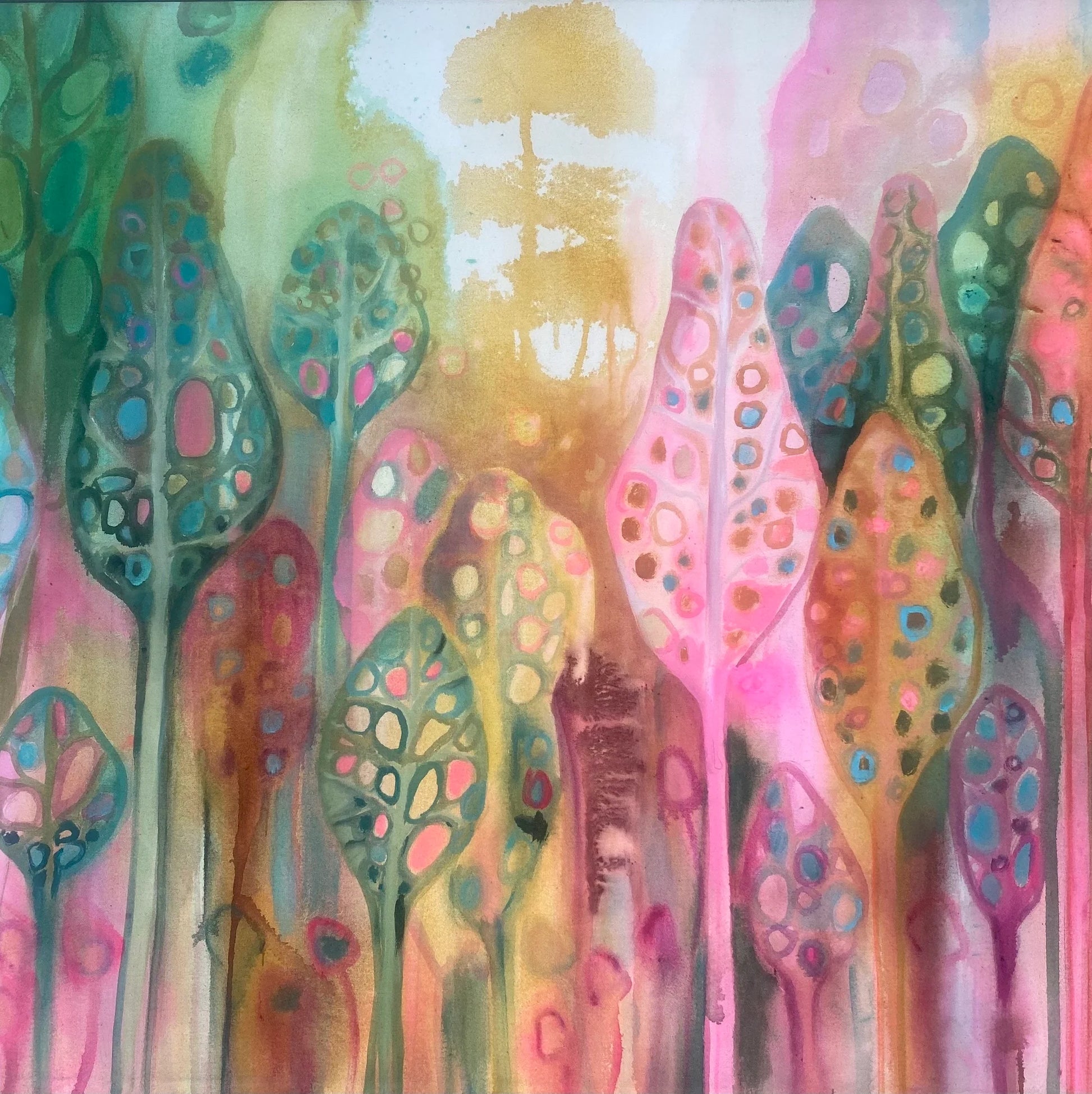 In this piece I have worked in a looser more imaginative style using really soft pink and green hues. Look out for the little mushrooms ..