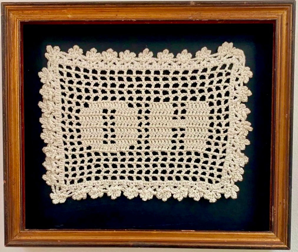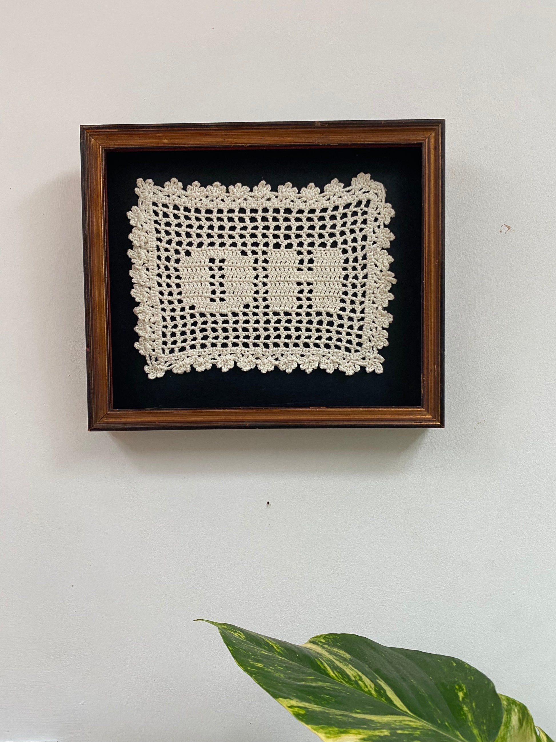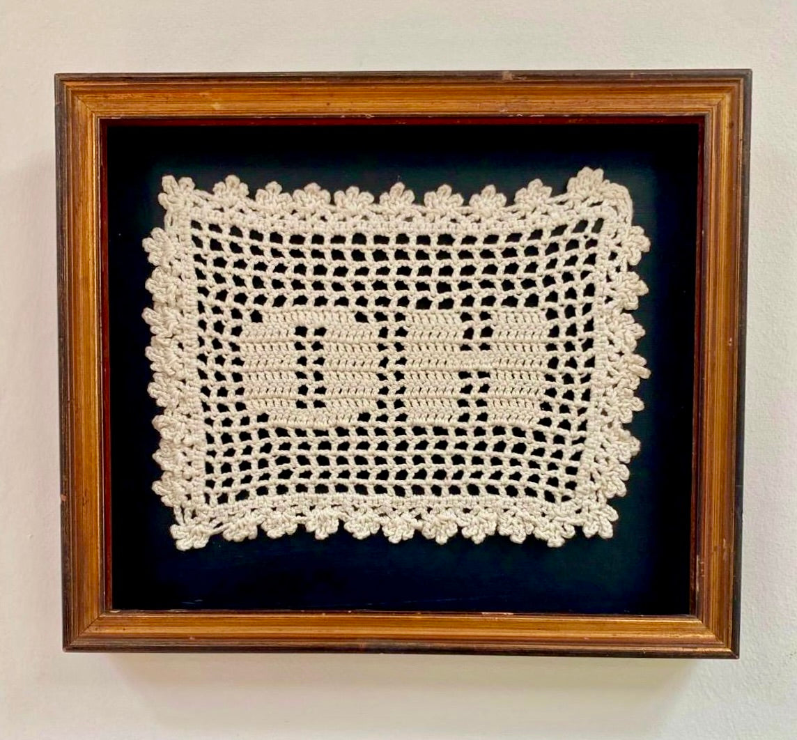 This piece is worked in filet crochet, its open grid pattern interrupted by the bold insertion of the letters “OH” at the center. The lace border, with its soft scallops, contrasts with the bluntness of the embedded text, pulling the viewer into the tension between delicacy and directness. Traditionally associated with decorative domestic textiles, here the crochet shifts from ornament to statement. The dark backing and simple wooden frame heighten the clarity of the text, giving the lace a voice that refuses to fade quietly into the background.